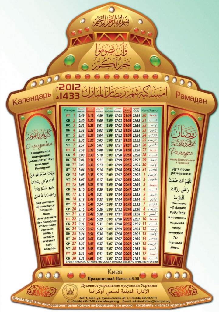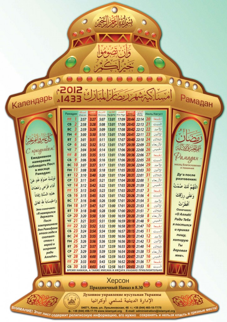 الادارة الدينية لمسلمي أوكرانيا / اوكرانيا اليوم / عزيزي القارئ بمناسبة قرب حلول شهر رمضان المبارك، نقدم اليكم امساكية شهر رمضان المبارك 1433 هجرية الموافق 2012 ميلادية، و كل عام و انتم بخير.